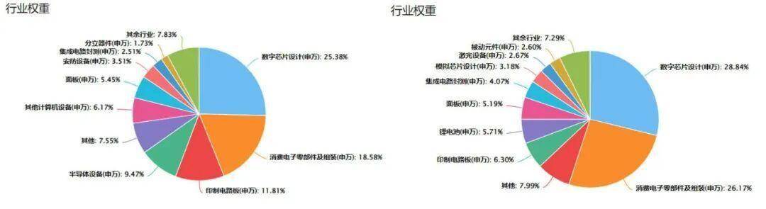 左边为中证电子50指数行业权重图,右边为消费电子指数行业权重图,通过对比我们可以发现,消费电子指数在数字芯片设计、消费电子零部件及组装均高于前者。