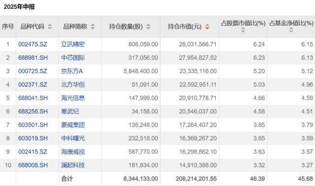 前十大重仓股包括寒武纪、立讯精密、海光信息等行业领军企业,形成芯-屏-端-软-智的全产业链布局。