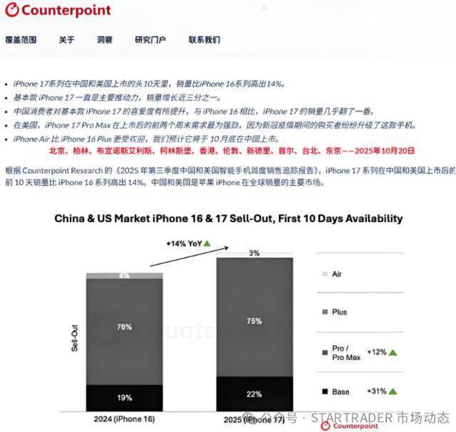 此次苹果股价创下新高,更多是市场对iPhone17首发销售数据的即时反应。据Counterpoint Research最新报告,iPhone 17系列在中美市场开售后的前10天,销量较上一代提升14%,远超市场预期。