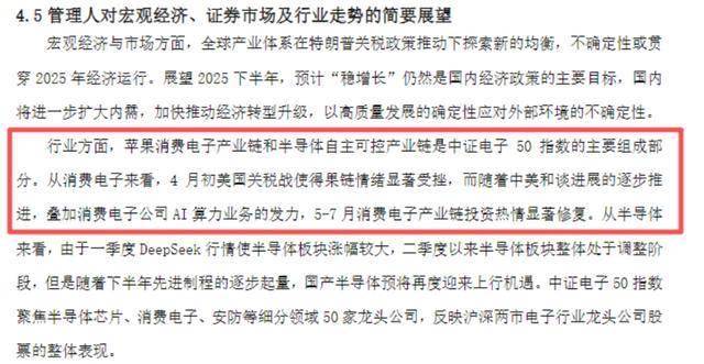 该基金经理在近期中报中表示,行业方面,苹果消费电子产业链和半导体自主可控产业链是中证电子50指数的主要组成部分,该指数反映沪深两市电子行业龙头公司股票的整体表现。