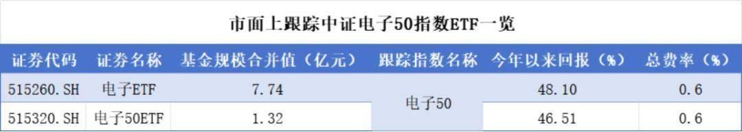 Choice数据显示,市面上跟踪中证电子50指数的ETF共有两只,分别是电子ETF和电子50ETF(515320.SH),总费率相同,对流动性有要求的投资者可以关注前者。