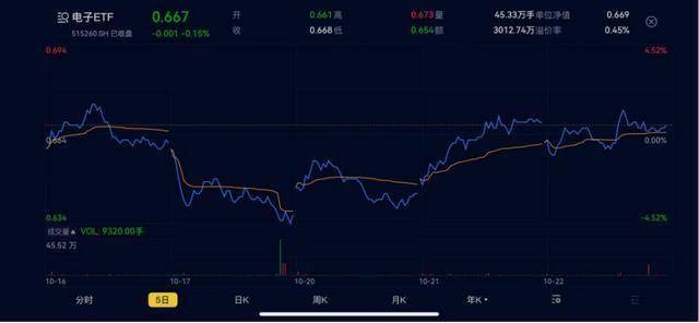 10月21日,覆盖半导体+苹果产业链的电子ETF(515260.SH)场内涨幅最高上探4.0%,收涨3.7%,一举收复5日均线。