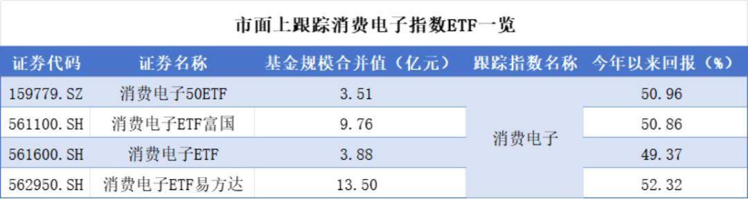 跟踪消费电子指数的ETF共有4只,较具有代表性的是消费电子ETF易方达(562950.SH),该基金规模最大,为13.5亿元,同时今年以来回报为52.3%,高于其余3只ETF。