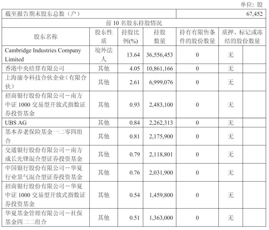 截至2025年6月30日,Cambridge Industries Company持股为13.64%,香港中央结算有限公司持股为4.05%,上海康令科技合伙企业(有限合伙)持股为2.61%,招商银行股份有限公司-南方中证 1000 交易型开放式指数证券投资基金持股为0.93%;