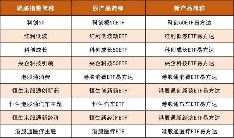 例如,对通过港股通机制投资港股的行业主题ETF,在简称中加入“港股通”字样,如将“恒生创新药ETF”调整为“港股通创新药ETF易方达”;还有去掉冗余汉字或数字,如将跟踪科创50指数的“科创板50ETF”调整为“科创50ETF易方达”,将跟踪科创成长指数的“科创成长50ETF”更名为“科创成长ETF易方达”。