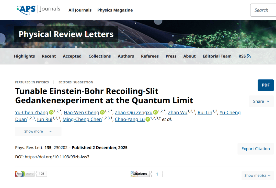 九章团队利用光镊囚禁的量子基态单原子,首次忠实地实现了1927年爱因斯坦和玻尔争论中提出的“反冲狭缝”量子干涉思想实验,观测到了原子动量可调谐的干涉对比度渐进变化过程,证明了海森堡极限下的互补性原理,并展示了从量子到经典的连续转变过程。相关成果以编辑推荐的形式2025年12月3日发表于国际期刊《物理评论快报》。美国物理学会Physics栏目以“单原子的爱因斯坦狭缝”为题进行专题报道。