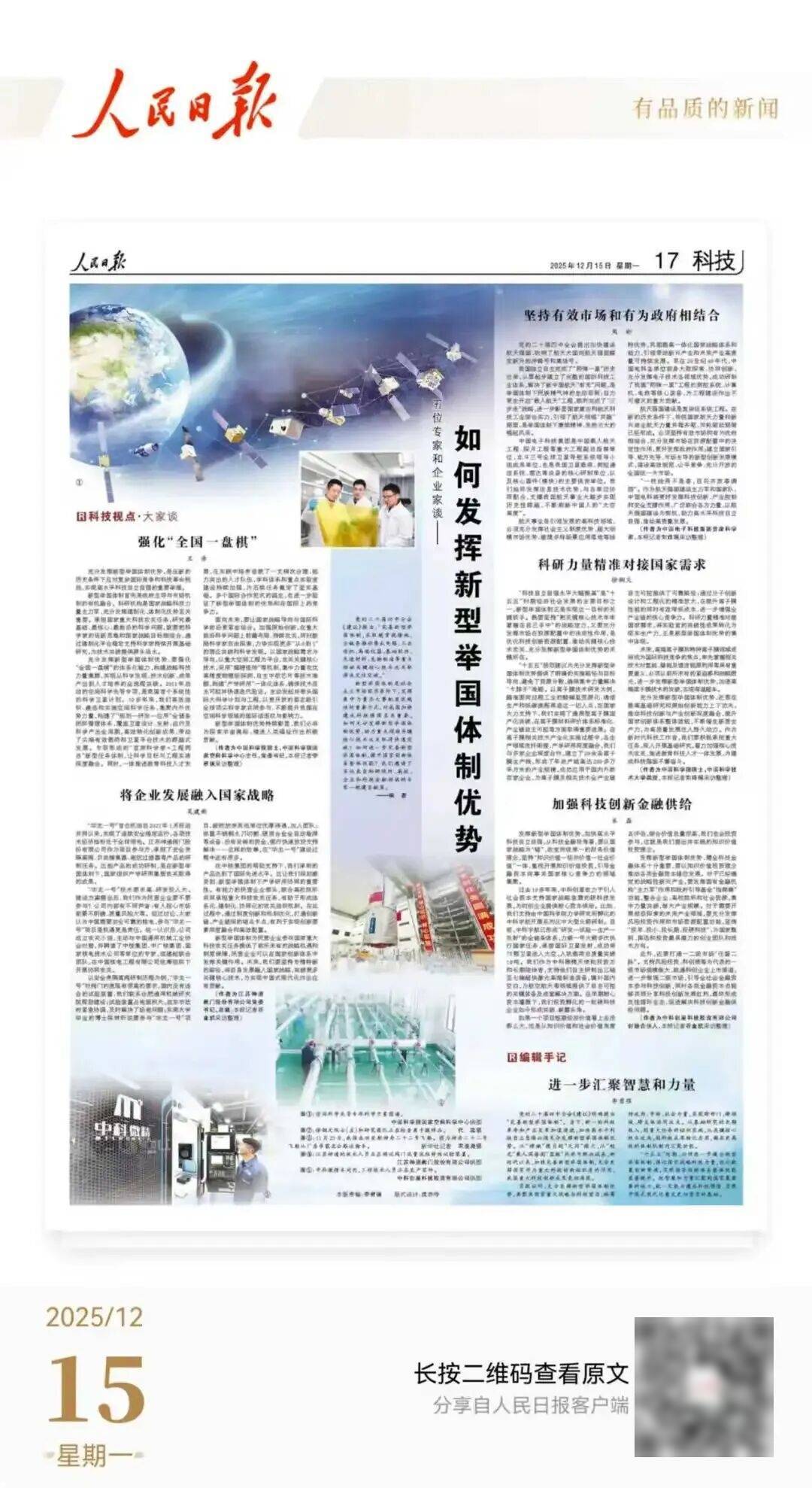 12月15日,《人民日报》重磅推出专版报道《如何发挥新型制优势(科技视点·大家谈)》。中科创星创始合伙人米磊发表观点提出,坚持“知识价值—经济价值—社会价值”一体,重视开展知识价值投资,引导金融资本向事关国家核心竞争力的领域集聚。并以中科宇航、中科微精为例,介绍了“过去10多年来,中科创星致力于引入社会资本支持国家战略急需的硬科技发展,为初创企业提供耐心资本供给。”