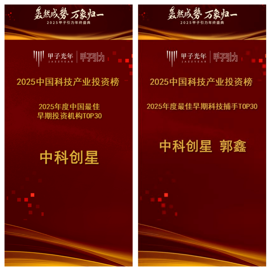12月3日,甲子引力「2025中国科技产业投资榜」榜单揭晓,中科创星荣获“2025年度最佳早期投资机构”。中科创星合伙人郭鑫荣获“2025年度最佳早期科技捕手”。