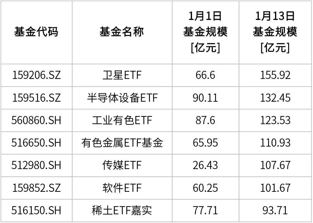 随着资金快速涌入,多只ETF规模快速增长,规模超过百亿元。其中,截至2025年底,广发传媒ETF规模为26.43亿元,到了2026年1月13日,规模已增至107.67亿元。永赢卫星ETF规模也从66.6亿元增至155.92亿元,嘉实软件ETF规模从60.25亿元增至101.67亿元。