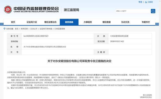 2026-02-19华体会,华体会体育官网,华体会体育,华体会体育APP下载2月14日,浙江证监局官网发布对永安期货股份有限公司(以下简称永安期货)采取责令改正措施的决定。同时,浙江证监局还发布了对相关责任高管马志伟、黄志明、葛国栋采取出具警示函措施的决定。