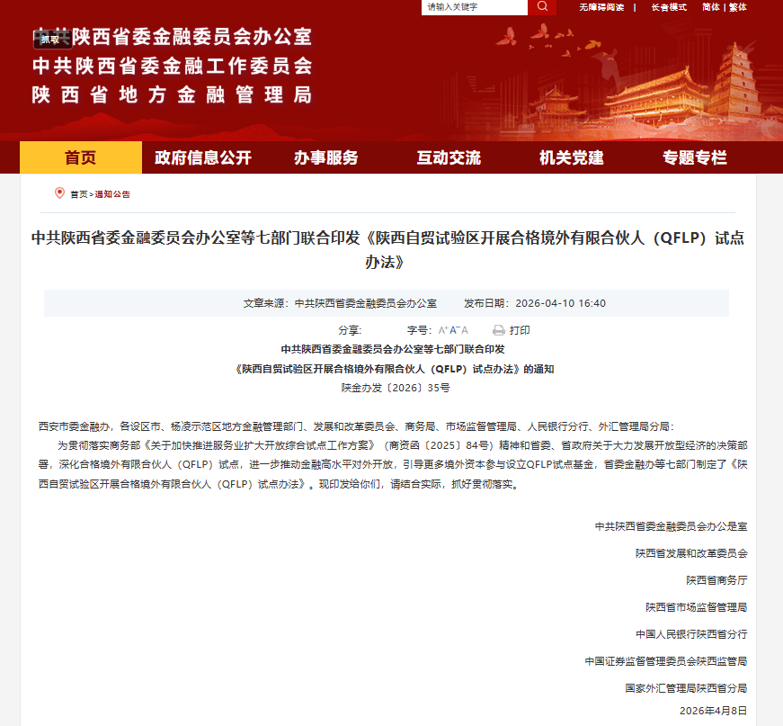 2026-04-14华体会,华体会体育官网,华体会体育,华体会体育APP下载为贯彻落实商务部《关于加快推进服务业扩大开放综合试点工作方案》(商资函〔2025〕84号)精神和省委、省政府关于大力发展开放型经济的决策部署,深化合格境外有限合伙人(QFLP)试点,进一步推动金融高水平对外开放,引导更多境外资本参与设立QFLP试点基金,省委金融办、省发展改革委、省商务厅、省市场监管局、人民银行陕西省分行、陕西证监局、国家外汇管理局陕西省分局等七部门联合制定了《陕西自贸试验区开展合格境外有限合伙人(QFLP)试点办法》。