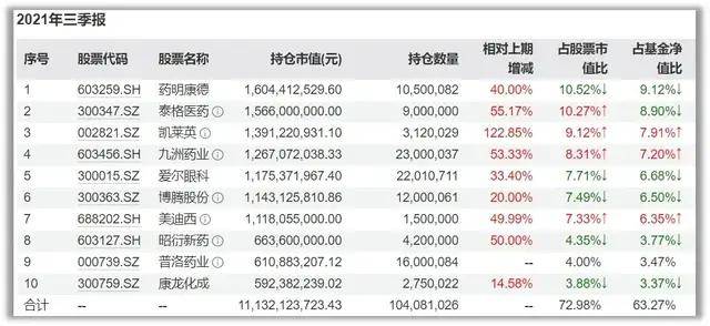 2021年三季度末,前十大重仓股包括了药明康德、凯莱英、博腾股份、泰格医药、九洲药业、美迪西等8家CXO企业。CXO的浓度依然很高。