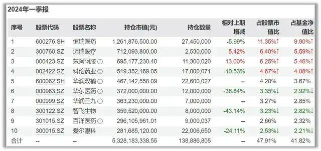 而伴随着CXO的崩塌,赵蓓也开始了大幅砍仓。到2024年一季度,赵蓓管理的基金前十大重仓股占比41.82%——比起63.27%的峰值,已经收敛了不少。基金的持仓股更是大换血,医疗器械、中药、创新药、消费医疗、医药商业全面开花。高位时候的笃定和低位时候的悲观,天差地别。