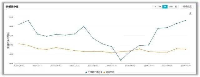 2025年一季度,工银前沿医疗A的前十持仓占比还是59.06%,到了三季度跃升至61.61%,年底进一步攀升至63.33%。一年时间,集中度提升了4个百分点。