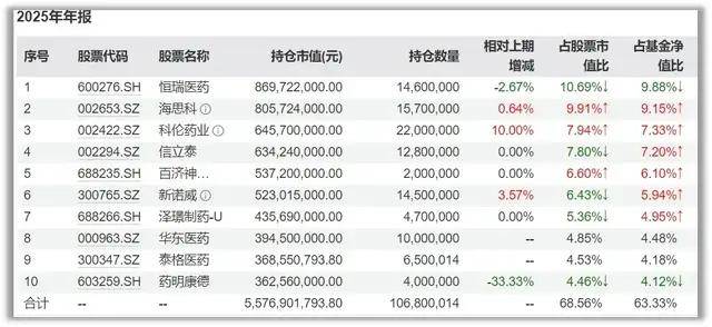 看看她都买了什么。根据2025年年报,前十大重仓股中,科伦药业、海思科、百济神州等创新药企占据了核心位置。前十大重仓股中有8家创新药企业。