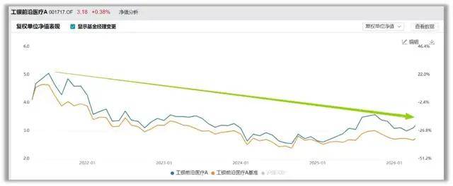 但后来的故事大家都知道了。2021年下半年开始,CXO板块深度回调。工银前沿医疗A的净值快速下降,基金的管理规模也从最高的176.25亿元一路下降,到2025年底仅剩下77.77亿元。