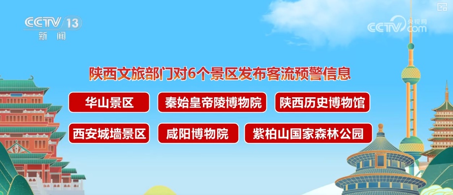 陕西文旅部门通过监测重点A级旅游景区客流情况,对分别是华山景区、秦始皇帝陵博物院、陕西历史博物馆、西安城墙景区、咸阳博物院等6个景区发布客流预警信息。