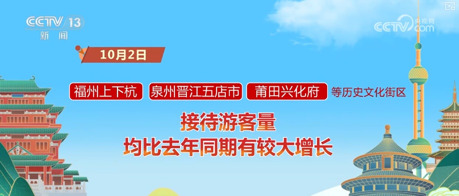 福建的各类历史文化街区、古城、古镇持续火爆。福州上下杭、泉州晋江五店市、莆田兴化府等历史文化街区,10月2日接待游客量均比2024年同期有较大增长。