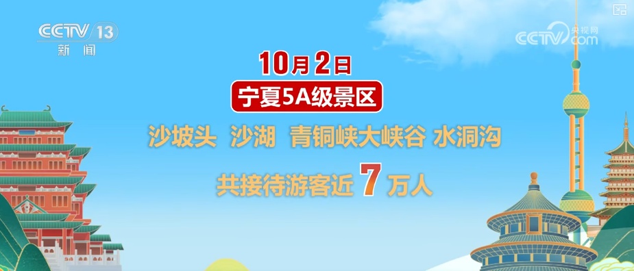 宁夏5A级景区沙坡头、沙湖生态旅游区、青铜峡大峡谷、水洞沟是游客的热门打卡地,这几个核心景区10月2日共接待游客近7万人次。