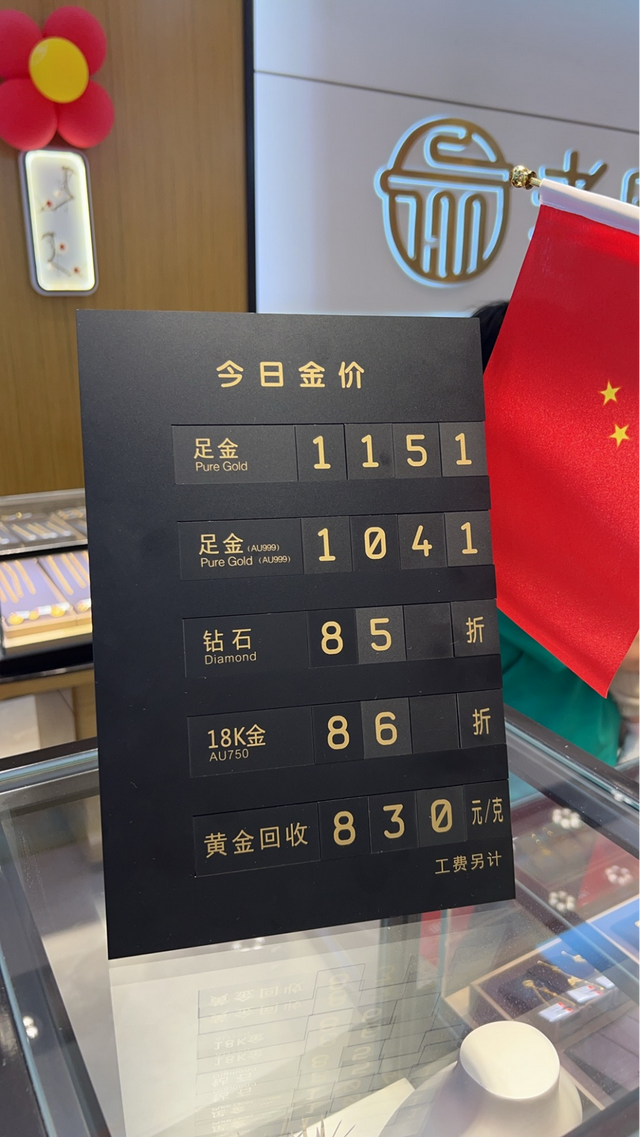 被问到是否盈利时,她表示生意虽不如前,但还能勉强维持。“我们优势在于金价低,工费也只要20–30元/克,别的店通常70–80元/克起步。另外我们还做回收,今天回收价是900元/克。”她提到现在不少准备结婚的顾客觉得品牌金价太高,转而选择去银行买金条,再拿到她这样的店里加工成手镯、戒指和项链。“我们靠手艺赚点加工费,顾客里外能省不少钱。”