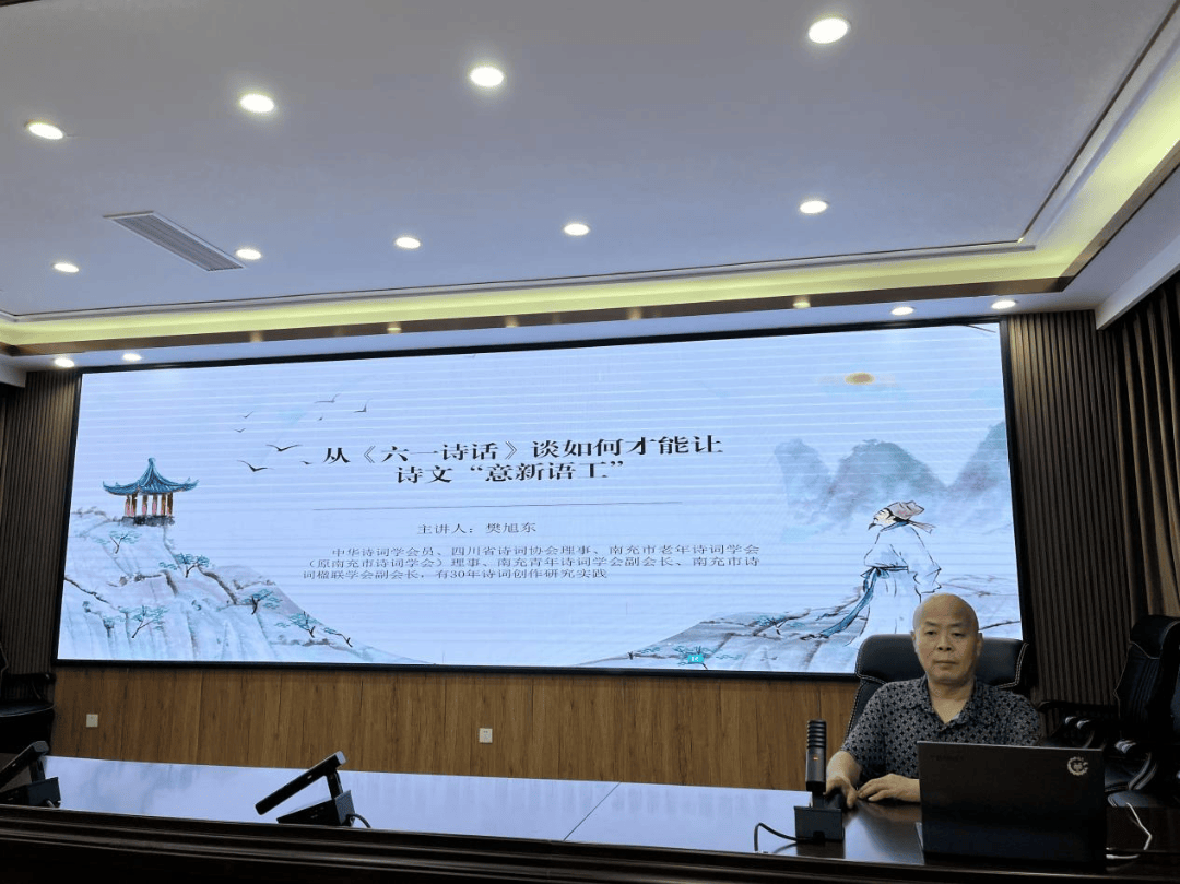 本次讲座由中华诗词学会会员、四川省诗词协会理事、市老年诗词学会理事、市青年诗词学会副会长、市诗词楹联学会副会长樊旭东先生主讲。拥有30年诗词创作与研究经验的樊旭东先生,以欧阳修《欧阳永叔诗话》(即《六一诗话》)为切入点,结合自身创作实践,深入浅出解析这部我国首部“诗话”著作的文学价值与现实意义。同时融入南充本土文化元素,分享诗词与生活实践结合的技巧,现场互动频频,掌声持续不断,让在场听众沉浸式感受古典诗词的美学魅力。