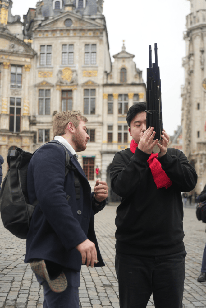 在布鲁塞尔演出前,无锡民族乐团来到布鲁塞尔漫画墙核心区带来街头快闪,演奏家们现场演绎《丁丁奇遇江南丝竹》,引得路人纷纷驻足、拍摄,并上前一探究竟。